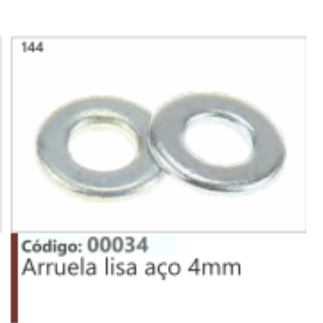 A imagem mostra uma arruela lisa de aço de 4mm, identificada pelo código 00034.