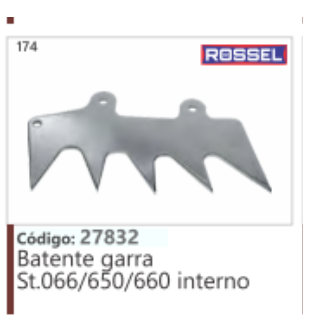 A imagem mostra um batente de garra interno para motosserras Stihl dos modelos 066, 650 e 660, com o código de produto 27832 da marca Rossel.
