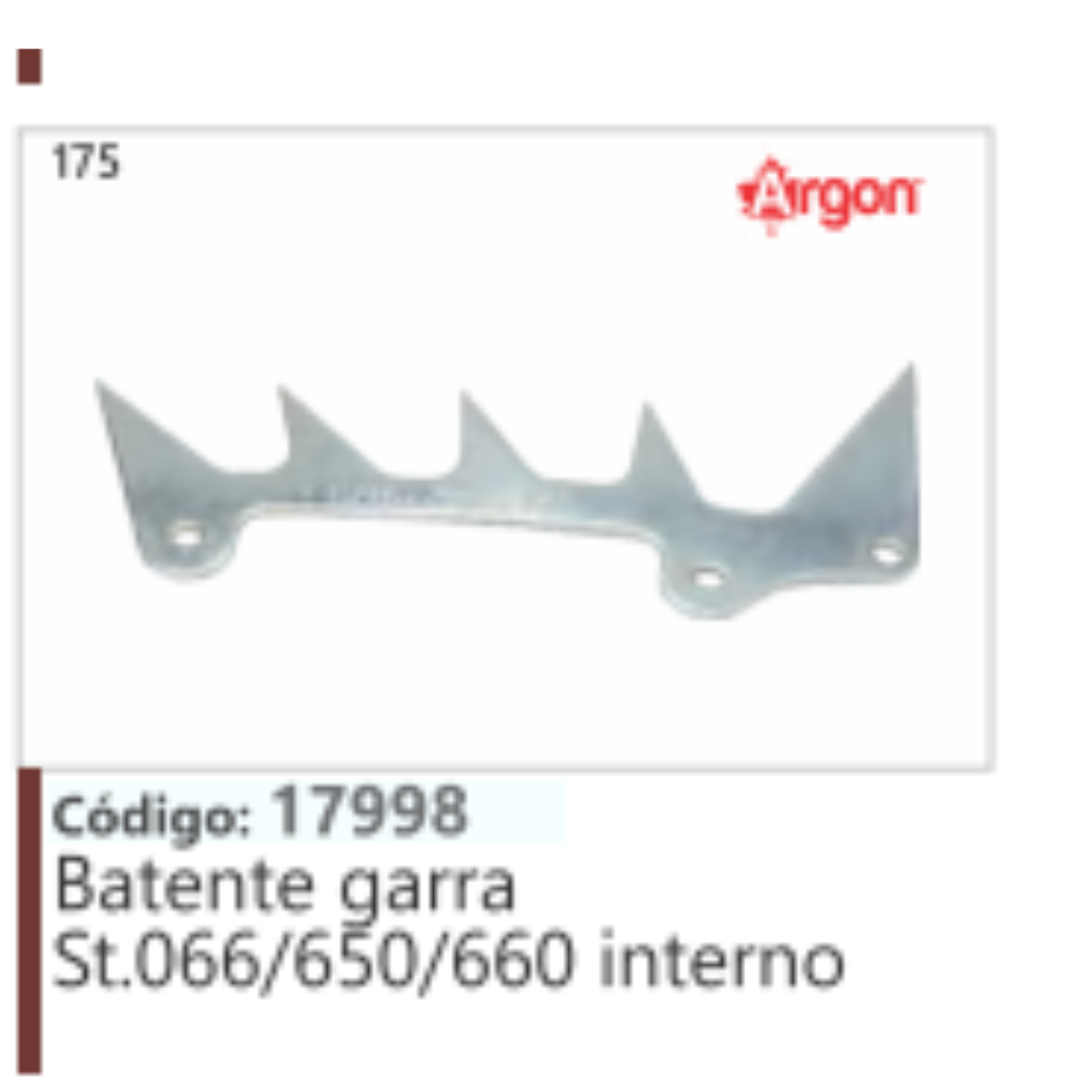 O item na imagem é um batente de garra interno da marca Argon, com código 17998, compatível com motosserras Stihl dos modelos 066, 650 e 660.