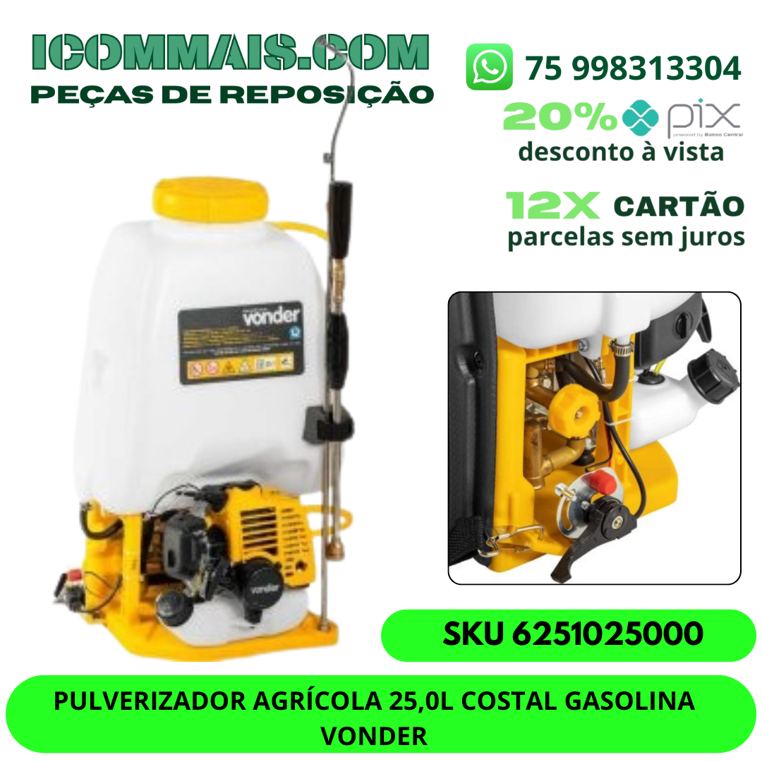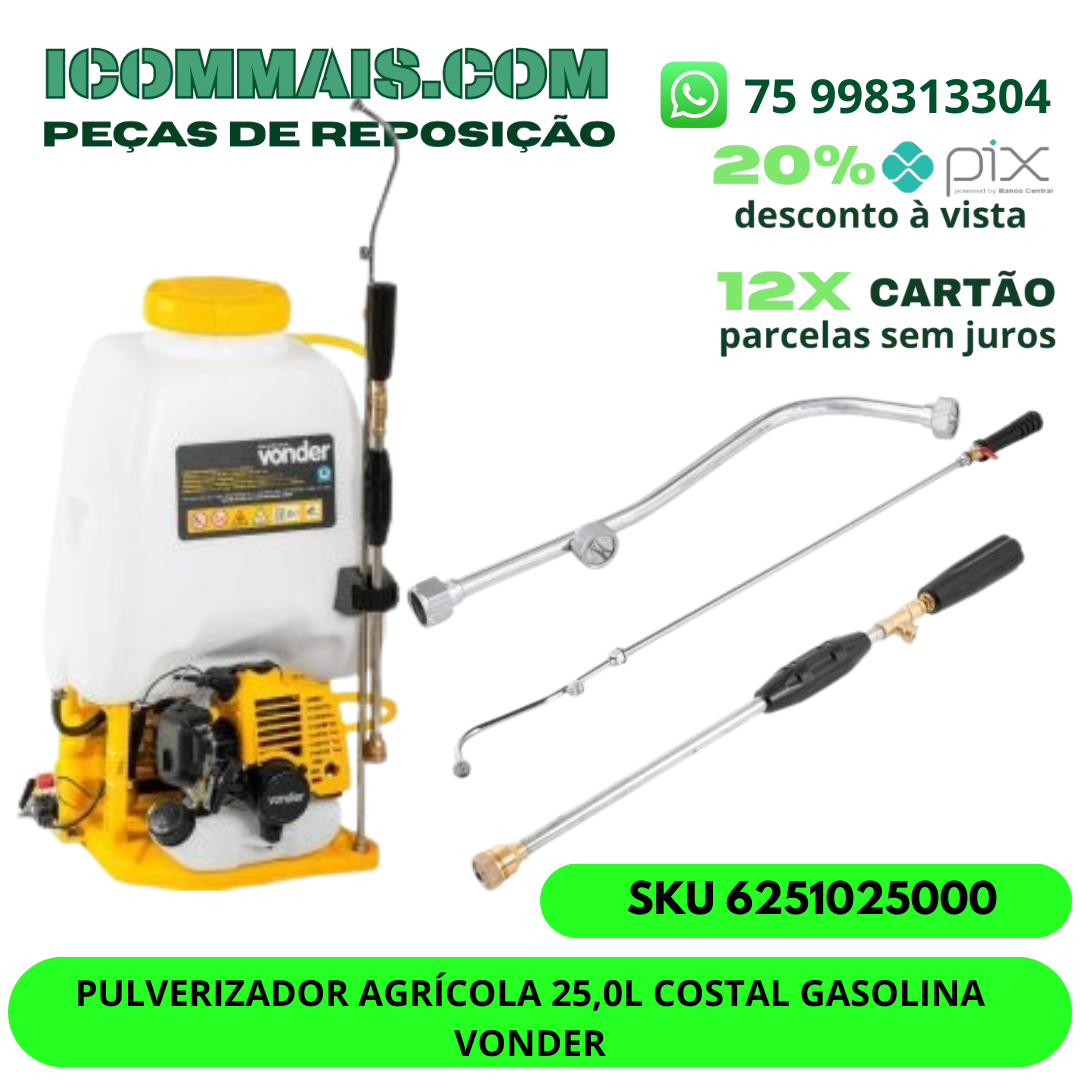 1 Pulverizador. Acompanha: 1 extensão, 1 lança com 2 bicos leque, 1 lança reta com regulador e bico cônico, 1 mangueira de pressão, 1 empunhadura, 1 kit de vedação, 1 chave de vela, 1 frasco dosador, 1 alça costal, 1 chave allen 10 mm, 1 chave allen 6 mm e 1 chave phillips.